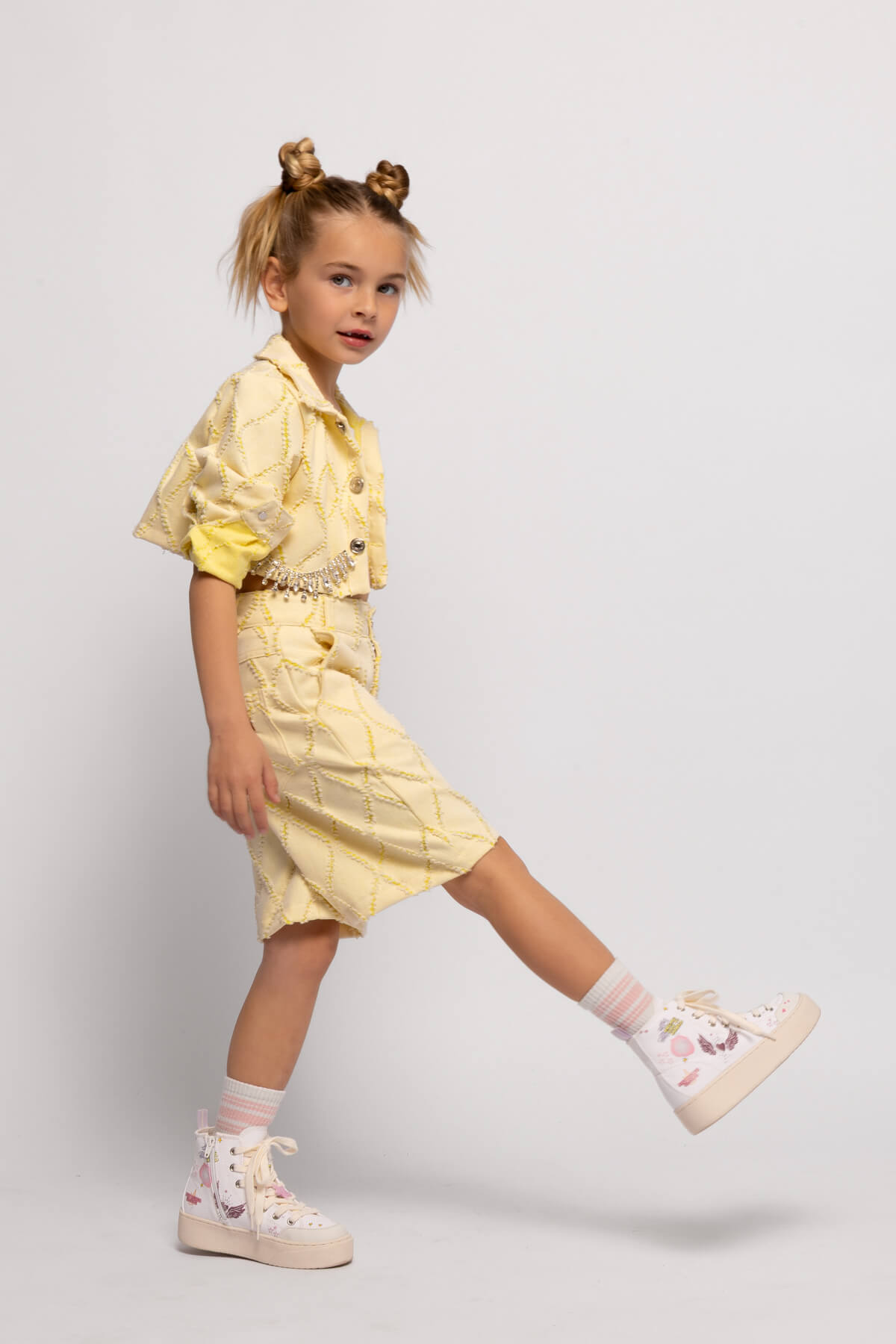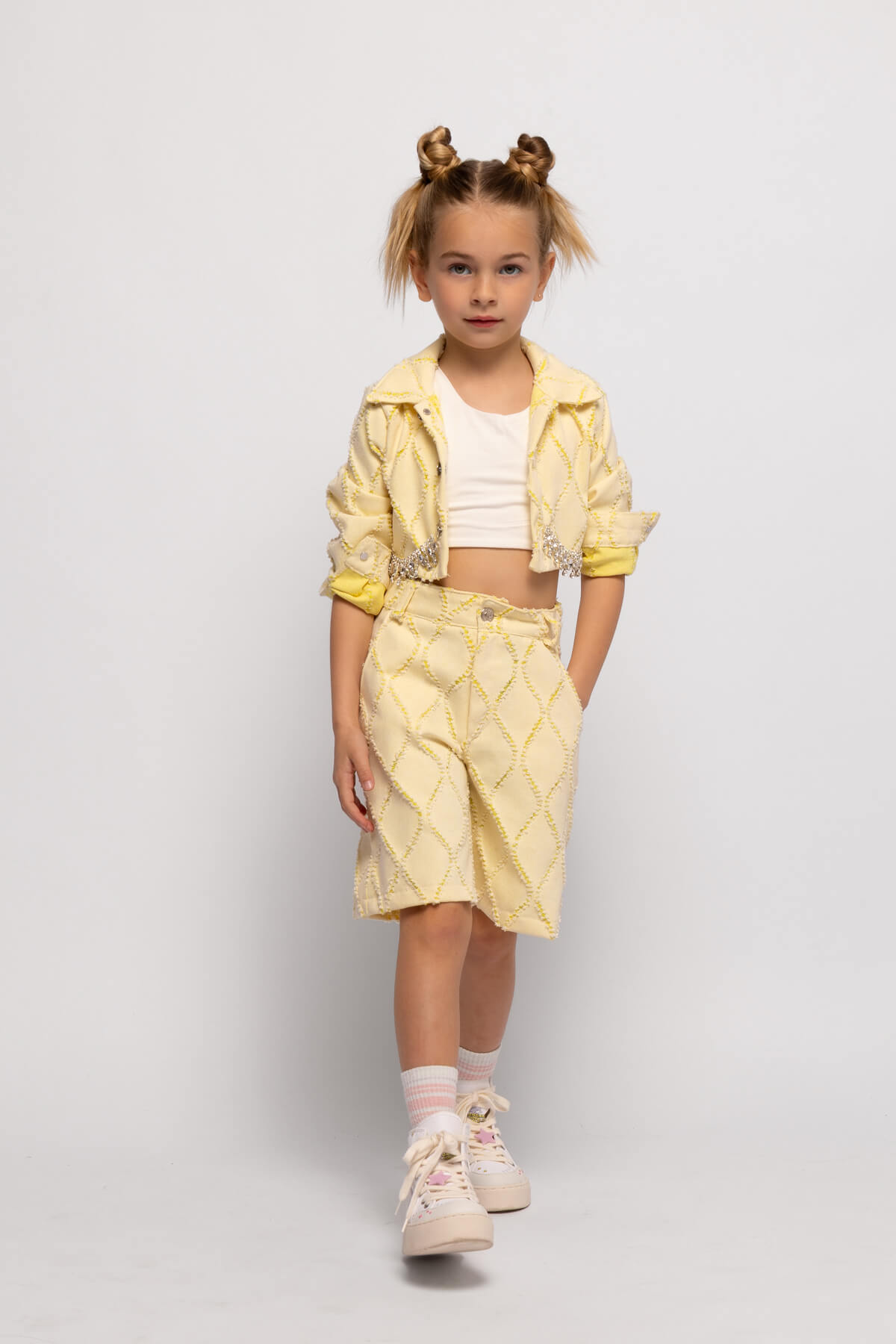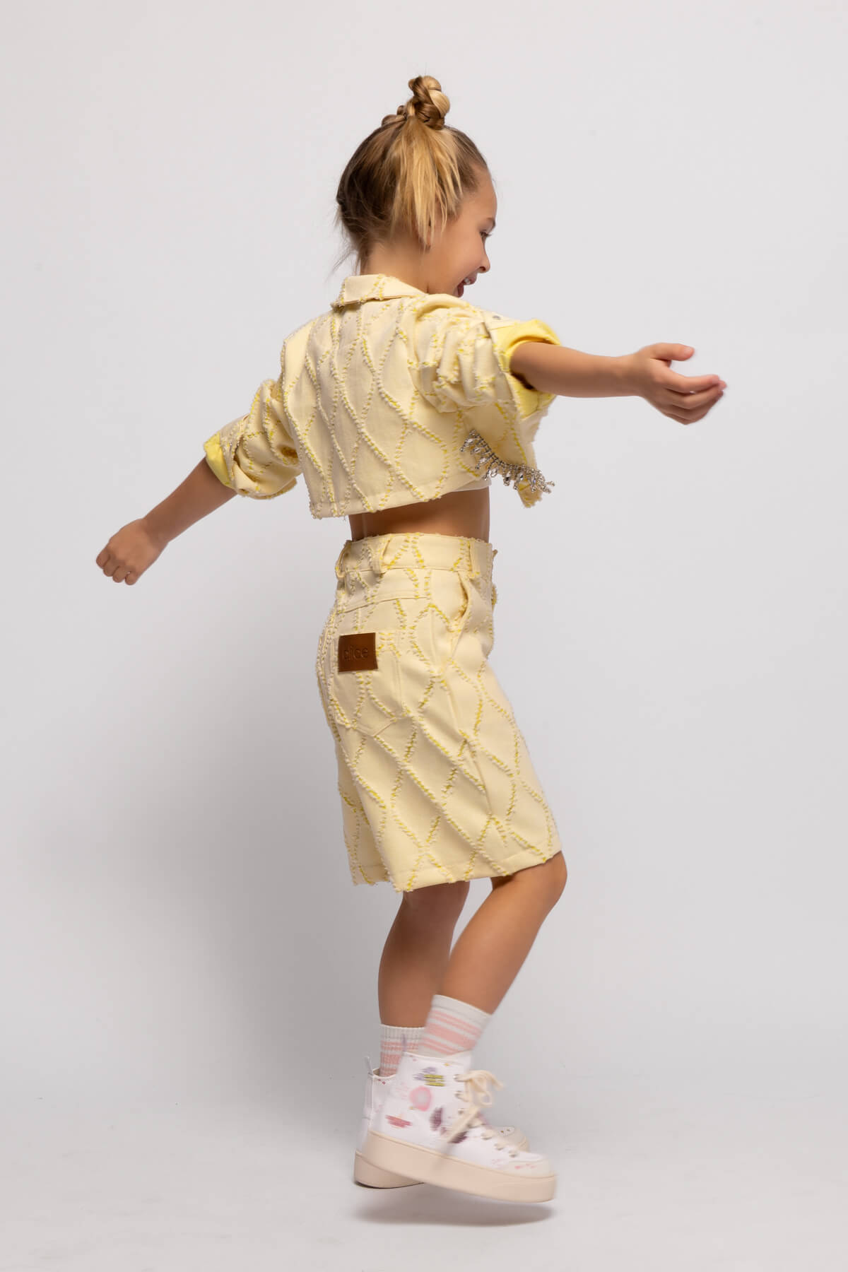 • Παιδική βερμούδα από laser cut ύφασμα τζίν, άνοιγμα φερμουάρ και κουμπι μπροστά από την Alice fashion