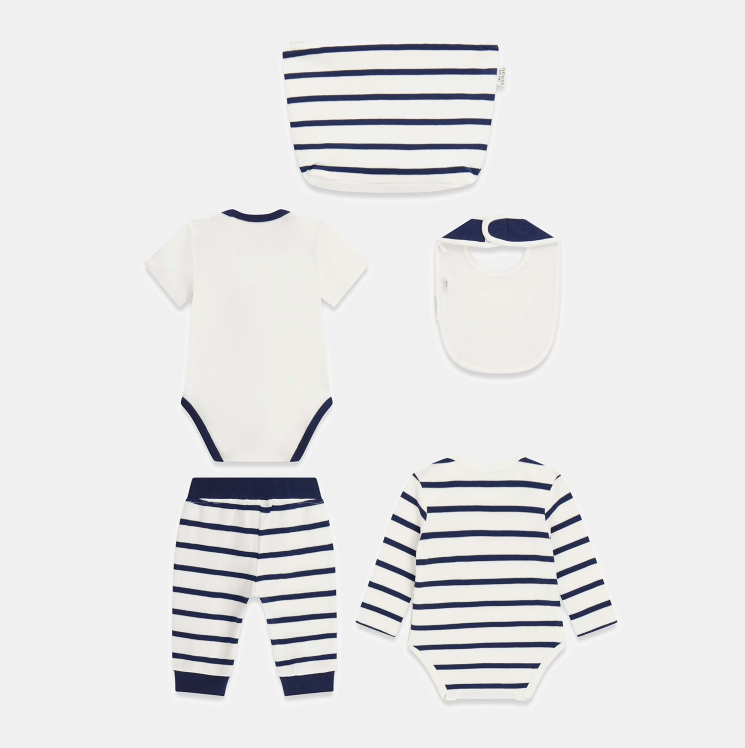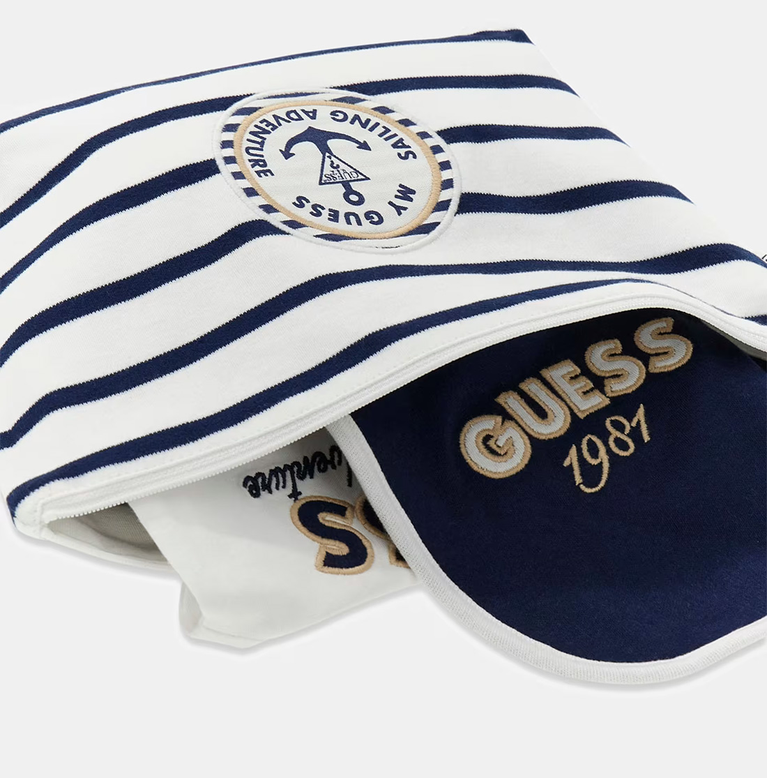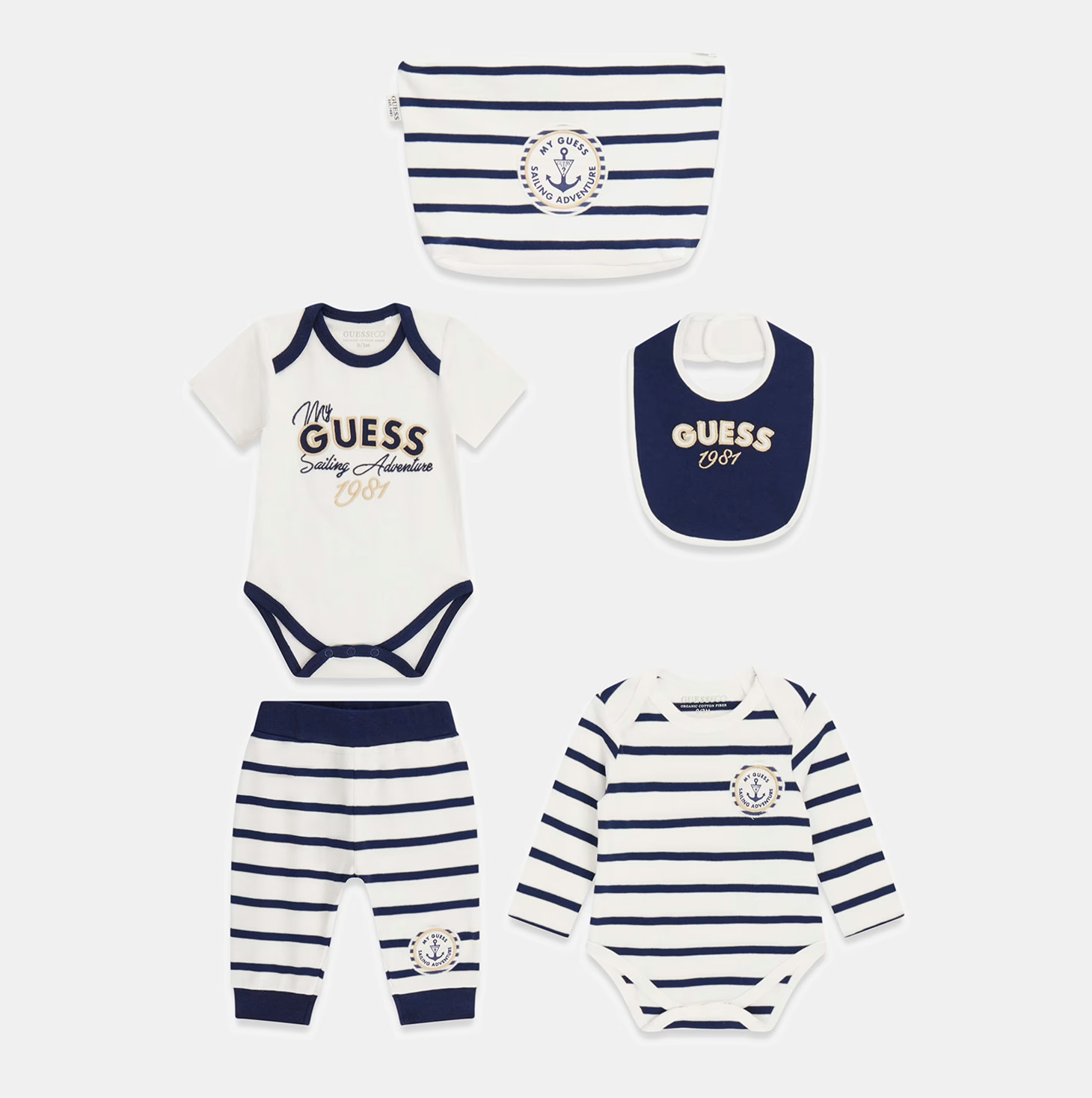 • Βρεφικό σετ Guess με 2 κορμάκια, παντελόνι, σαλιάρα & τσαντούλα (5τεμάχια)